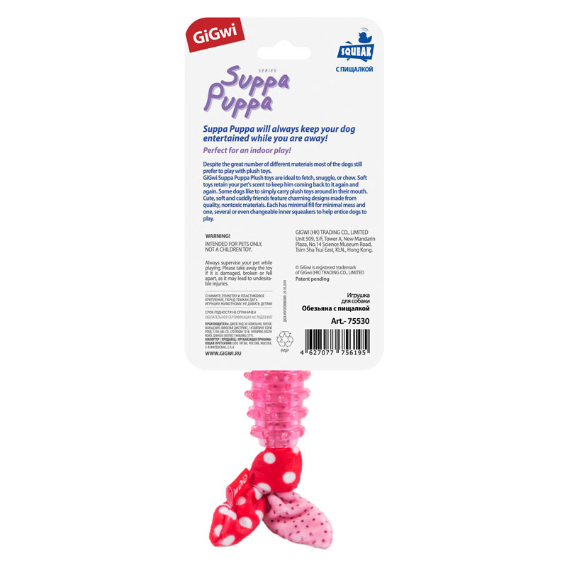 Игрушка для собак с набивкой выполнена из высококачественного текстильного материала и дополнена гантелей из TPR резины. Игрушка подходит для активных игр. Неабразивный, нетоксичный материал не ранит зубы и дёсны. Игрушка оснащена пищалкой для привлечения внимания питомца.