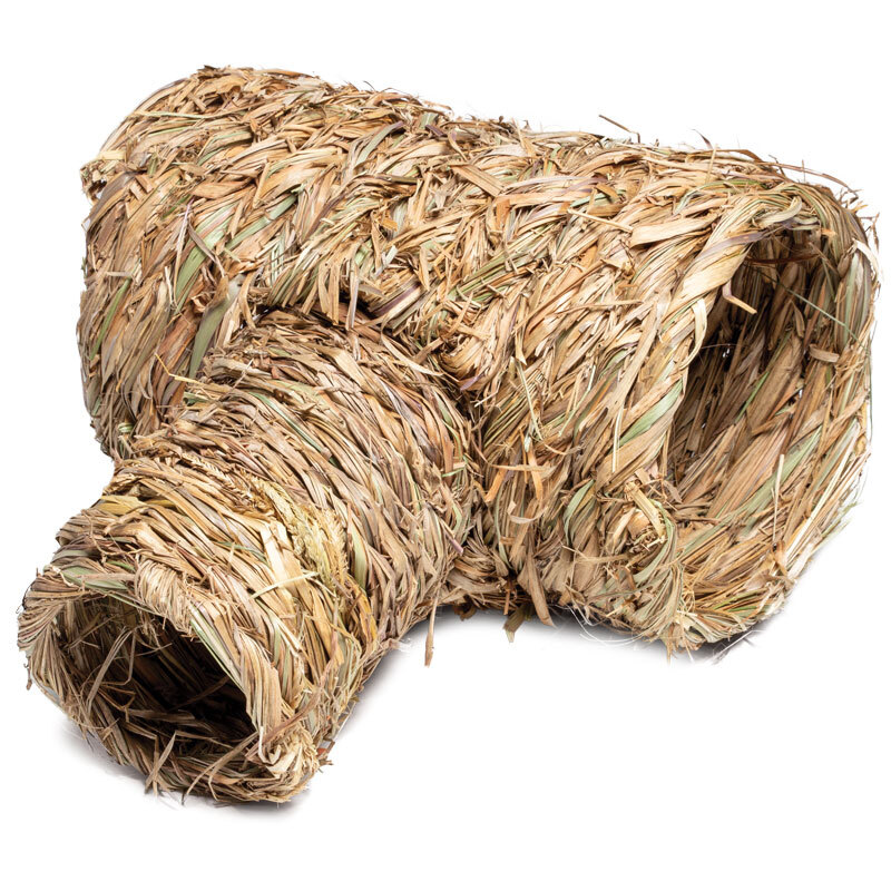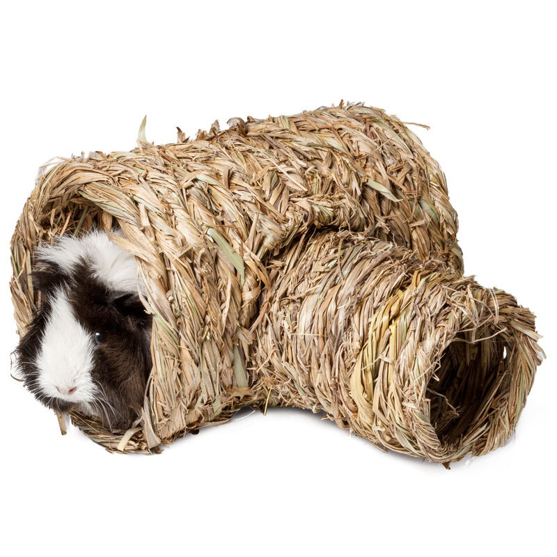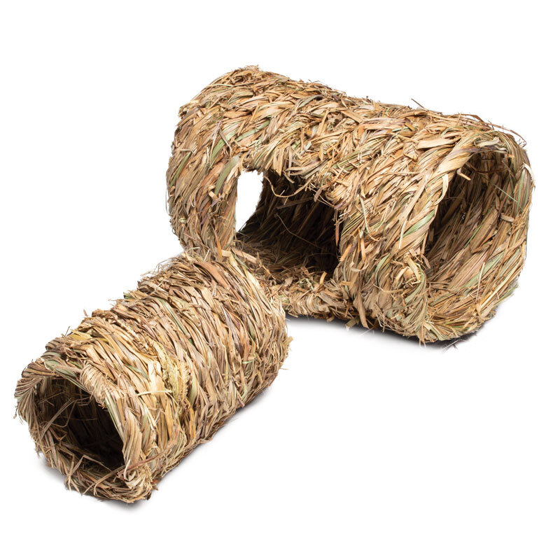 Оригинальный домик-труба для мелких животных выполнен из сухих стеблей и листьев луговых трав. Изделие имеет четыре отверстия, которые служат не только входами в домик, но и отличным поводом для активной игры. Изделие уютно для питомцев и долго сохраняет тепло за счет плотного плетения. Такой плетеный домик - идеальное место для комфортного отдыха домашнего грызуна и стильный декор для любой клетки. Состоит из двух отдельных элементов-труб, соединенных между собой. Легко разбирается на две составные части. Цвет: соломенный. Размер: большая труба - d160мм, длина 250мм; малая труба - d100мм, длина 170мм. Общая длина изделия (на картинке) - 290мм.