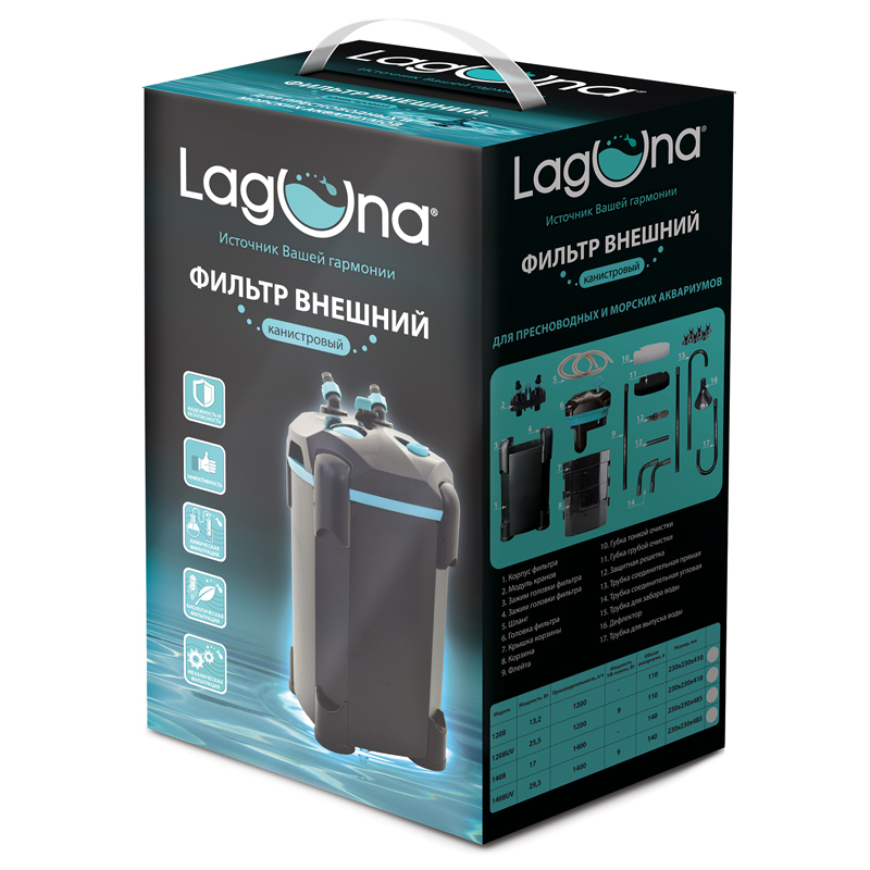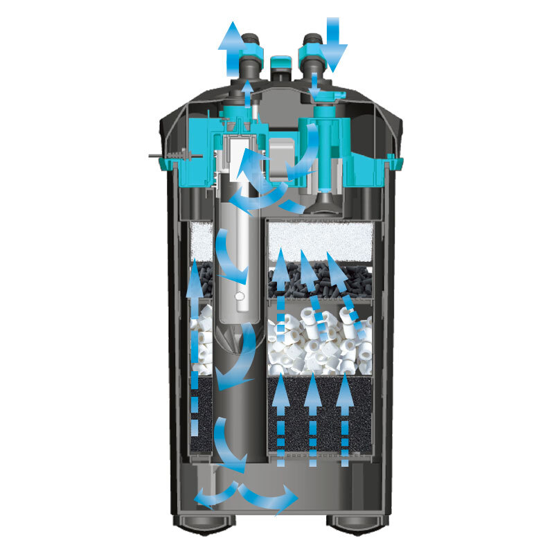 Внешний фильтр повышенной мощности отличается эффективностью и простотой эксплуатации. Производительность модели - 1400л/ч, мощность - 17Вт. Импеллер фильтра оснащен керамической осью, которая обеспечивает долгую службу ротора и тихую работу фильтра, а также дает возможность использовать фильтр как для пресноводных, так и для морских аквариумов. Встроенный насос ручной подкачки облегчает запуск фильтра. В комплект поставки входит полный набор для подключения фильтра (краны на вход/выход, шланги 16/22мм на вход/выход, защитная решетка заборной трубки, присоски, флейта с заглушкой). Фильтр имеет три фильтрационные корзины с фильтрующими материалами (губками) для грубой и тонкой очистки воды.