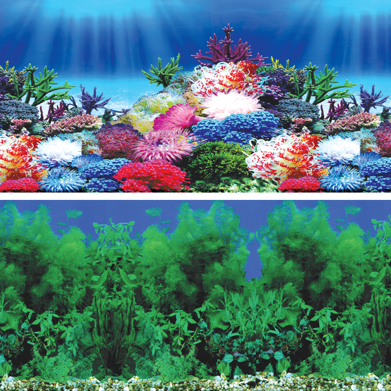 Двусторонний аквариумный фон на ламинированной бумаге с красочными фотографиями подводного мира. Фон для аквариума - это тот самый декоративный элемент, который не только скроет за собой все внешнее аквариумное оборудование, но и придаст аквариуму привлекательный внешний вид. Пленочные фоны - идеальное решение для вашего аквариума. Пленка с рисунком либо однотонная пленка клеится на заднюю стенку снаружи, так что в любой момент ее можно заменить. Если сам по себе аквариум не имеет особой привлекательности, то его можно украсить фоном с изображением подводного ландшафта. Если же дизайн аквариума не подразумевает применение цветного фона, идеальным решением будет однотонная пленка.