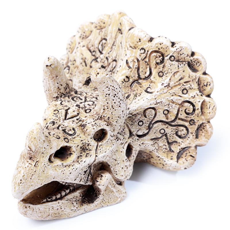 Небольшой реалистичный грот, стилизованный под череп ископаемого трицератопса - элемент для оригинального оформления любых пресноводных аквариумов, а так же для террариумов. Этот грот послужит дополнительным укрытием для маленьких рыб, отвечая тем самым не только за эстетику, но и принося обитателям аквариума реальную пользу. Такой грот может быть использован как самостоятельный элемент декора - для оформления небольшого аквариума, так и в комплекте с другими гротами, объемными фонами и искусственными растениями - для оформления аквариума большого объема. Изготовлен из нетоксичной полиэфирной смолы, очень прочный и долговечный, удобный в эксплуатации и совершенно безвредный для аквариумных жителей.