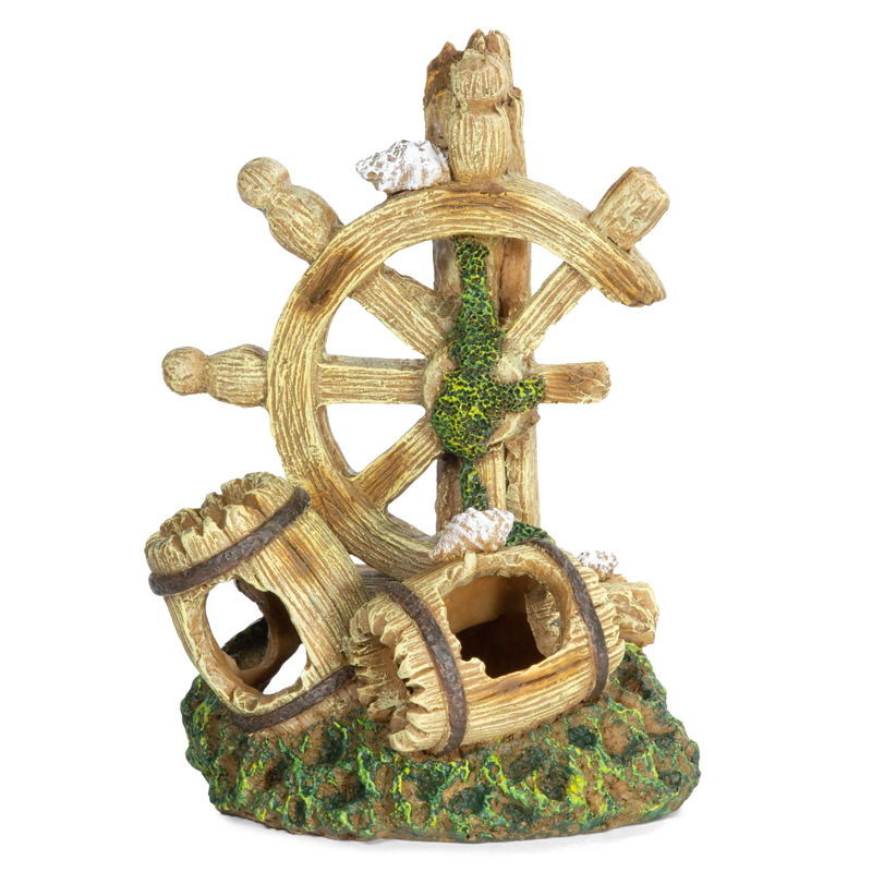 Этот функциональный и максимально реалистичный грот - незаменимый элемент для оригинального оформления любых пресноводных или морских аквариумов. Сломанный штурвал, разбитые бочки, свидетельства кораблекрушения - все это можно найти на морском дне. Этот грот послужит дополнительным укрытием для небольших рыб, отвечая тем самым не только за эстетику, но и принося обитателям аквариума реальную пользу. Такой грот может быть использован как самостоятельный элемент декора - для оформления небольшого аквариума, так и в комплекте с другими гротами, объемными фонами и искусственными растениями - для оформления аквариума большого объема. Изготовленный из нетоксичной полиэфирной смолы, очень прочный и долговечный, удобный в эксплуатации и совершенно безвредный для аквариумных жителей, этот грот прослужит вам долгие годы, украшая собой ваш "компактный подводный мир" - на радость вам и его обитателям.
