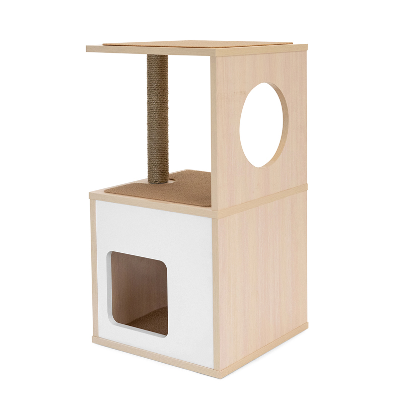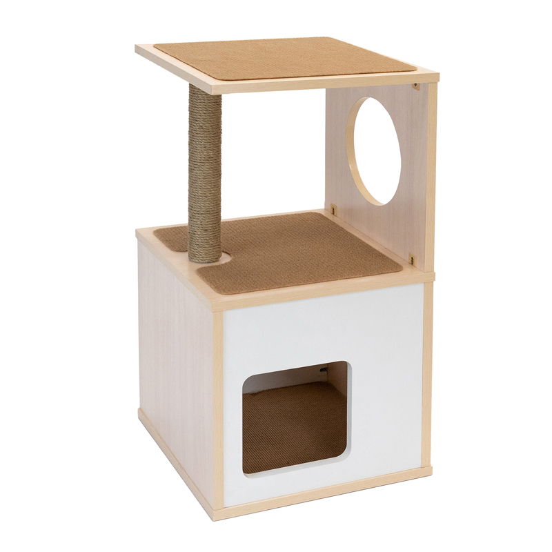 Двухъярусный игровой комплекс для кошек с уютным домиком и одним столбиком-когтеточкой - идеальное решение для обеспечения досуга вашего питомца. Комплекс выполнен из ламинированного МДФ - практичного, надежного, изящного и экологичного материала. Горизонтальные платформы обиты оригинальным утапливаемым ковролином. Цвет: бежевый. Размер: 370*370*725мм