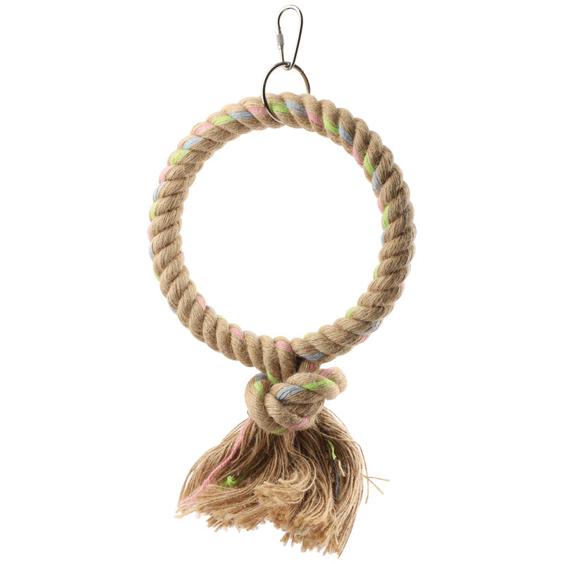 Игрушка для птиц - кольцо-качели. Верёвочные игрушки необходимы каждой птице. Птица не только точит когти и клюв, она может лазить по ним, укрепляя мышцы и поддерживая свой организм в тонусе. Верёвочные игрушки вызывают у птиц неподдельный интерес. Крепление: карабин. Цвет: бежевый. Размер: d165/300мм.