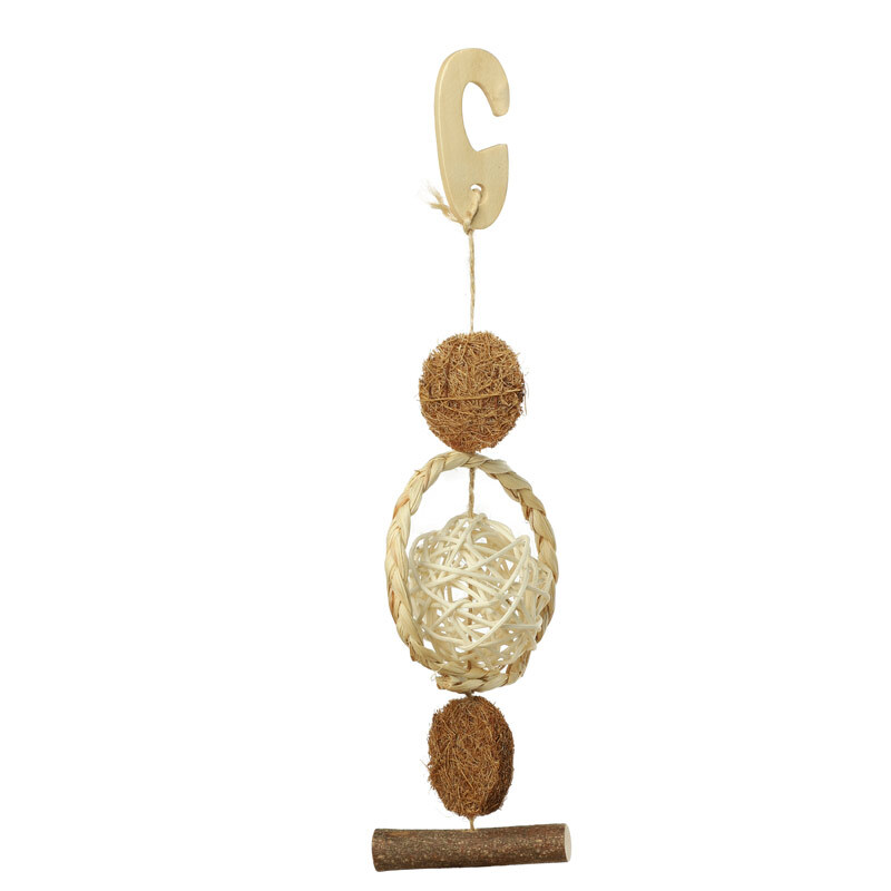 Игрушка для птиц "Шарик с кольцом" выполнена в виде подвески из натуральных материалов: большого плетеного кольца, шарика из ротанга, двух долек из кокосового волокна и деревянного бруска. Крепление: деревянный крючок. Цвет: бежево-коричневый. Размер: 200/255*d75мм.