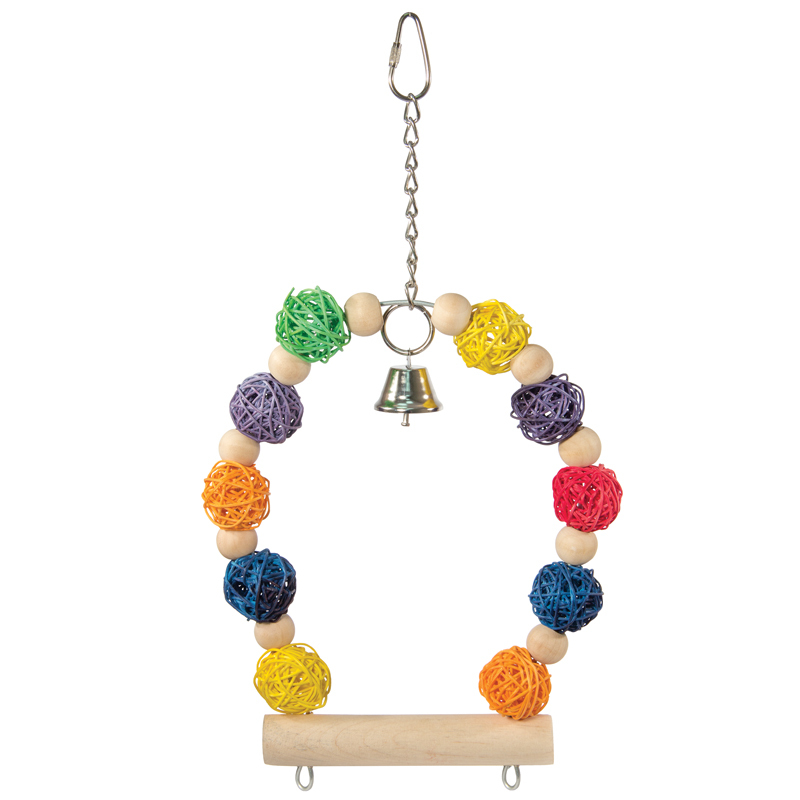 Игрушка для птиц в виде качелей с плетеными и деревянными шариками. Крепление: карабин. Размер: 205/295*180мм.