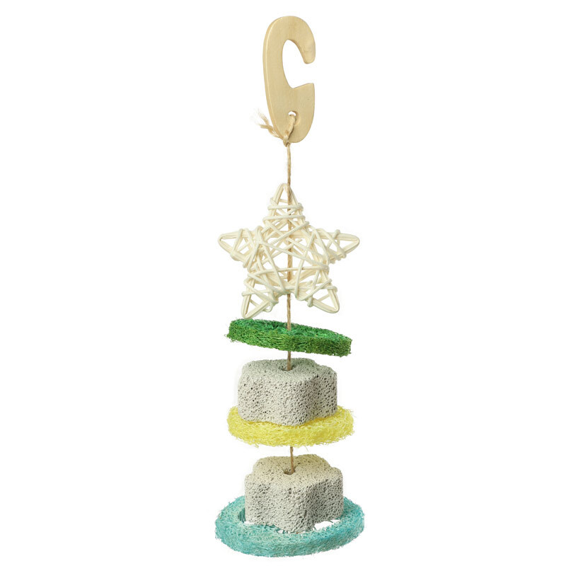Игрушка для птиц "Звезда с дольками" выполнена в виде подвески из натуральных материалов: ротанга, долек люфы и пемзы. Пемза прекрасно подходит для природного стачивания клюва и когтей птицы. Крепление: деревянный крючок. Цвет: белый. Размер: 175/230*d60мм.