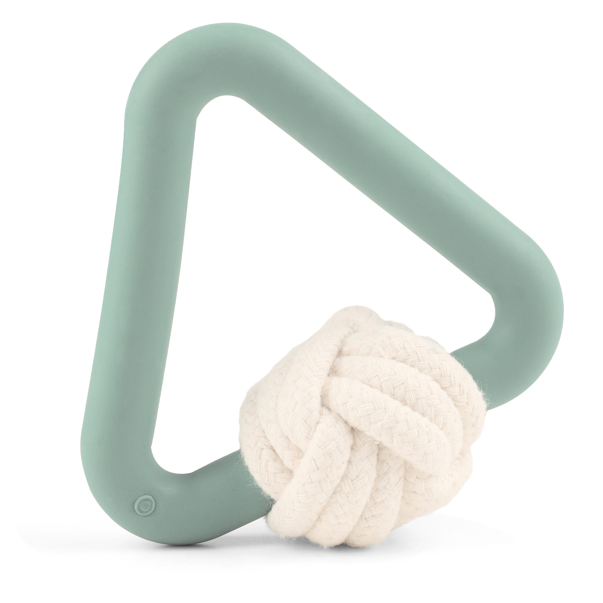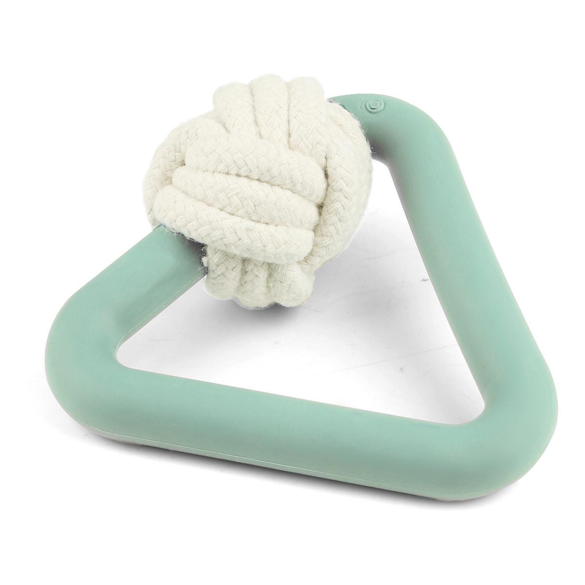 Игрушка в форме треугольника с веревочным мячом выполнена из термопластичного эластомера - инновационного материала, обладающего высокой прочностью, устойчивостью к внешним воздействиям и изменению температуры. Плетеный мяч изготовлен из хлопковых нитей, безопасных для вашего питомца. Сочетание двух материалов в игрушке сделает игру более разнообразной, а приятное цветовое сочетание будет радовать глаз. Цвет изделия: бело-голубой. Вес изделия: 90г. Размер изделия: 120*120*50мм.