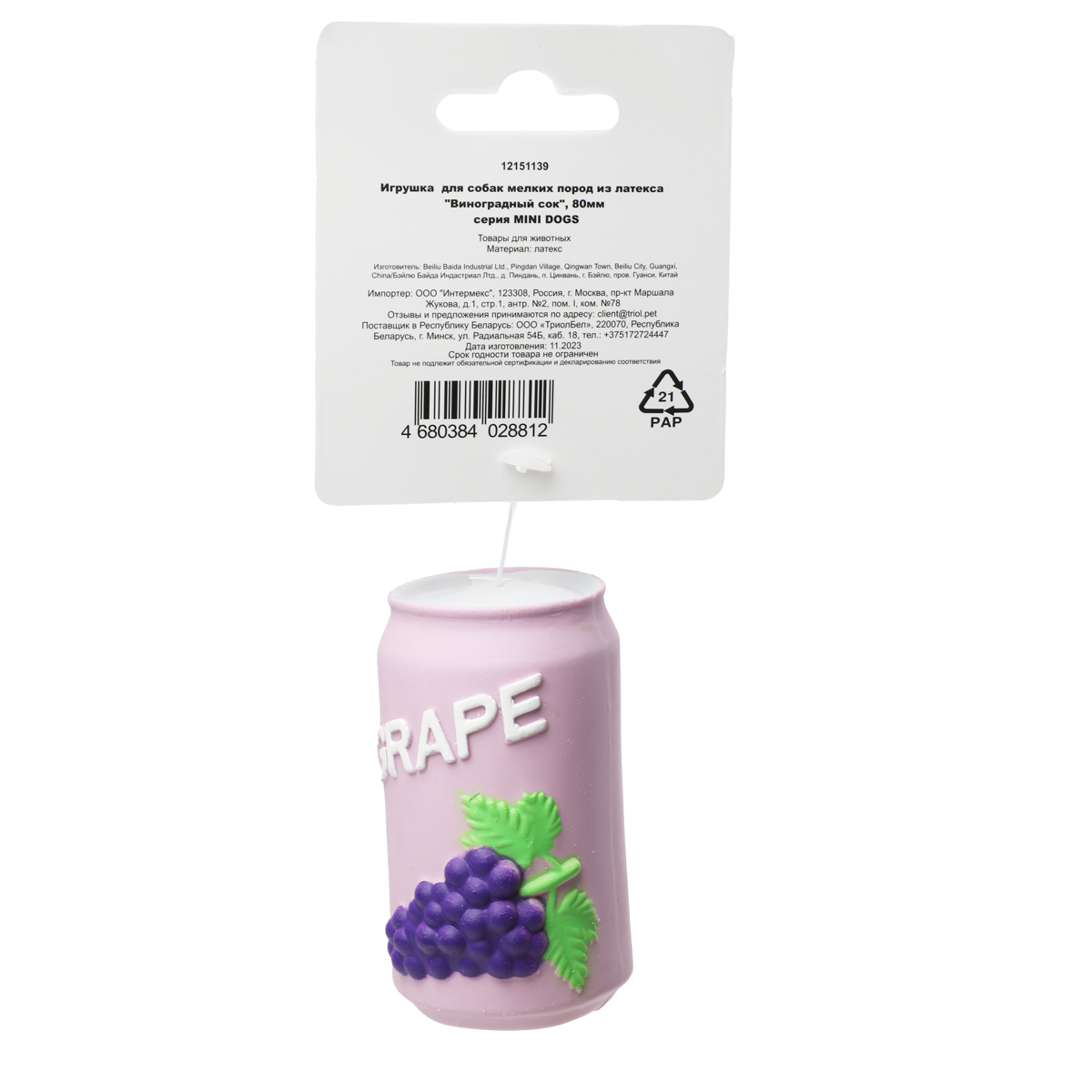 Забавная игрушка "Виноградный сок" серии MINI DOGS изготовлена из латекса - натурального экологически чистого материала, который не содержит токсичных веществ и безопасен для животных. Такая игрушка приятна на ощупь, прочная и яркая, она также отлично очищает зубы, массирует десны и помогает собаке снимать стресс в отсутствие хозяина. Изделие отлично подходит для собак мелких пород, а также - для щенков в период прорезывания зубов. Благодаря продуманным габаритам изделие удобно носить в зубах, мягкая текстура позволяет питомцу заниматься любимым делом - грызть, кусать и трепать игрушку, а звонкая "пищалка" внутри изделия пробуждает охотничьи инстинкты животного, делая игру еще интереснее. Цвет: сиреневый. Размер: 80*45*45мм.