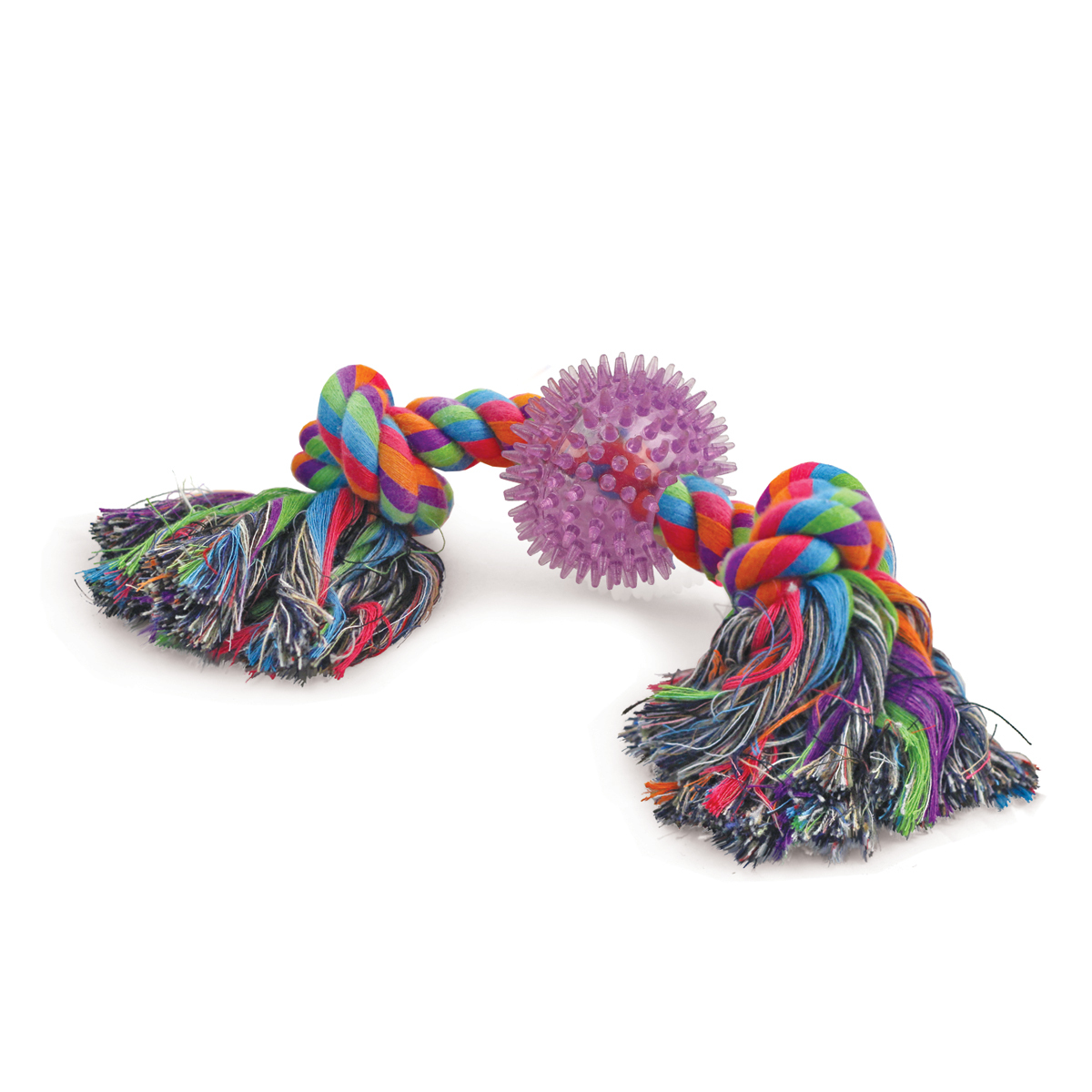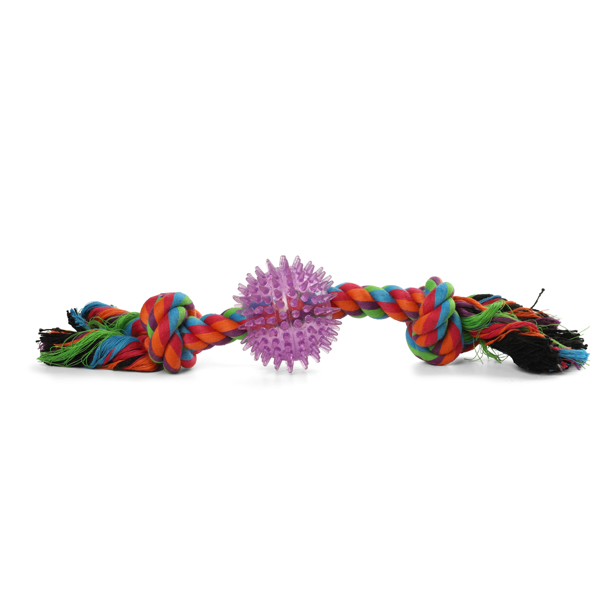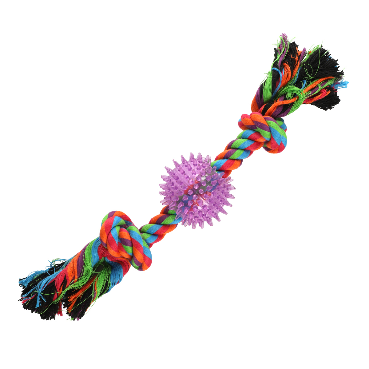 Собаки обожают играть с веревочными игрушками, так как их можно грызть, трепать и носить в зубах. Такие игрушки отлично массируют десны и очищают зубной налет во время игры. Веревки сплетены из нитей натурального хлопка, поэтому безопасны для здоровья Вашего питомца. Цвет: разноцветный. Вес: 140-150г. Длина веревки: 310мм. Размер мяча: d65мм.