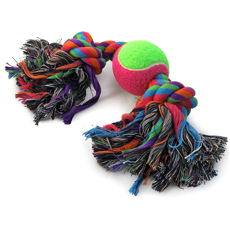 Собаки обожают играть с веревочными игрушками, так как их можно грызть, трепать и носить в зубах. Такие игрушки отлично массируют десны и очищают зубной налет во время игры. Веревки сплетены из нитей натурального хлопка, поэтому безопасны для здоровья Вашего питомца. Цвет: разноцветный. Вес: 250-260г. Длина веревки: 350мм. Размер мяча: d65мм.