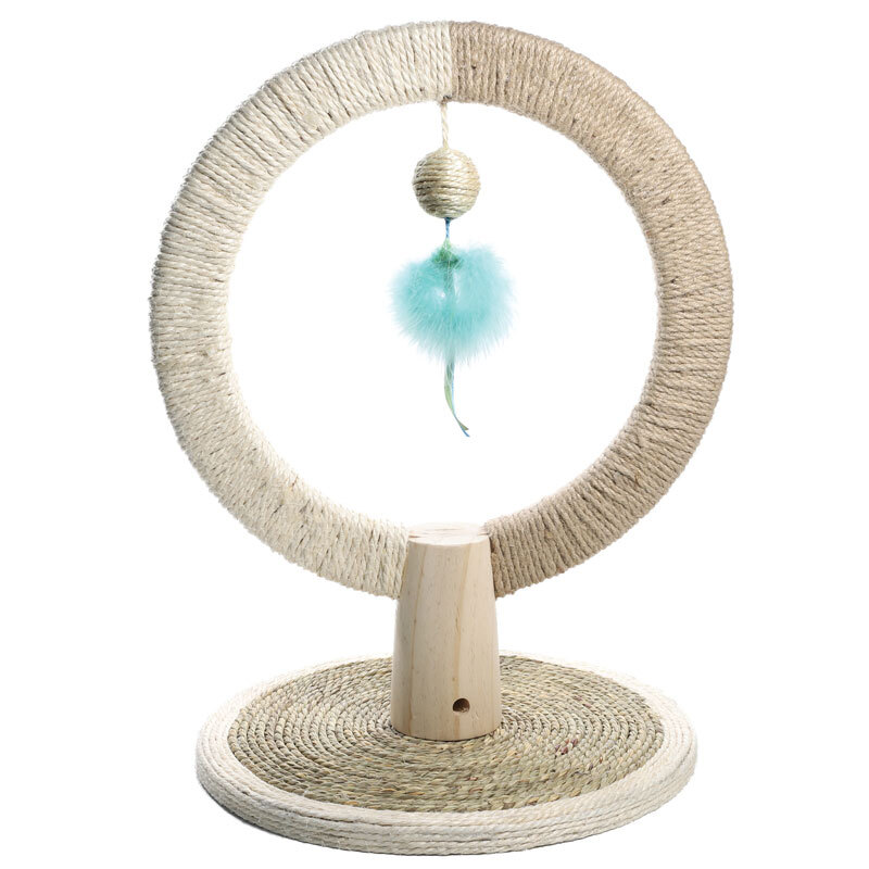 Когтеточки - обязательный аксессуар для личной гигиены кошек, который помогает животным избавиться от шелушащихся слоев когтя, причиняющих дискомфорт подушечкам лап. По своей природе сизаль обладает уникальным антистатичным свойством, следовательно, когтеточка не накапливает пыль, что облегчает процесс уборки. Особенность когтеточки "Кольцо" - необычная круглая форма изделия, натуральная сосна и морские водоросли в основании. Шарик из сизаля с воздушным пером - дополнительный аксессуар для игр и привлечения внимания кошки к когтеточке. Цвет: бежевый. Размер изделия: 350*350*495мм.