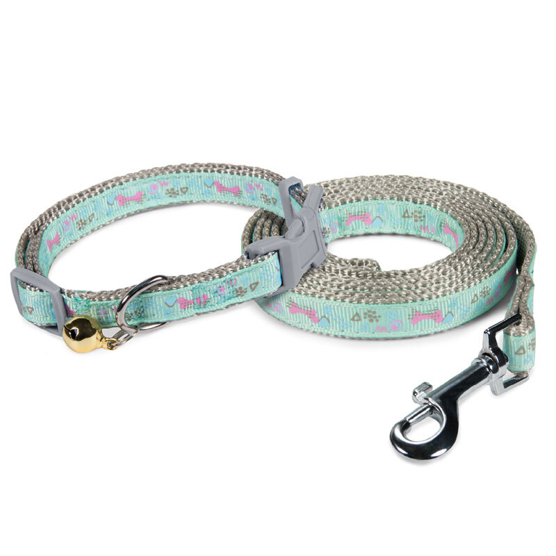 Комплект изготовлен из высококачественного нейлона с использованием крепкой металлической и пластиковой фурнитуры. Длина ошейника регулируется, сбоку от застежки имеется удобное кольцо для крепления поводка с мелодичным бубенчиком.
