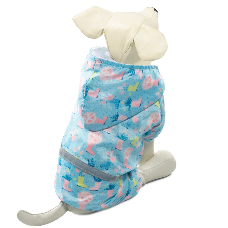 Костюм-дождевик "Букет" - это удобный и функциональный аксессуар для собак, который просто незаменим в дождливую погоду. Изделие защитит шерсть животного от дождя и грязи, а непродуваемая ткань - от сильного ветра. Костюм имеет стильный дизайн, а универсальный фасон не стесняет движений питомца во время прогулки. Особенностью дождевика является светоотражающая лента, идущая по талии изделия, - для повышения безопасности животного на дороге. Дождевик также имеет капюшон и фиксируется при помощи трех заклепок на животе, а на штанинах предусмотрены удобные резинки, препятствующие попаданию грязи и влаги снизу. Длина спины: 450мм; обхват груди: 540мм; обхват шеи: 390мм. Цвет: голубой.