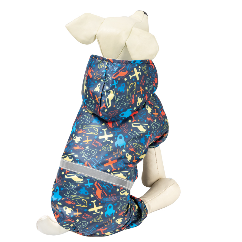 Костюм-дождевик "Полет" - это удобный и функциональный аксессуар для собак, который просто незаменим в дождливую погоду. Изделие защитит шерсть животного от дождя и грязи, а непродуваемая ткань - от сильного ветра. Костюм имеет стильный дизайн, а универсальный фасон не стесняет движений питомца во время прогулки. Особенностью дождевика является светоотражающая лента, идущая по талии изделия, - для повышения безопасности животного на дороге. Дождевик также имеет капюшон и фиксируется при помощи трех заклепок на животе, а на штанинах предусмотрены удобные резинки, препятствующие попаданию грязи и влаги снизу. Длина спины: 350мм; обхват груди: 460мм; обхват шеи: 330мм. Цвет: темно-синий с голубым, желтым и красным.
