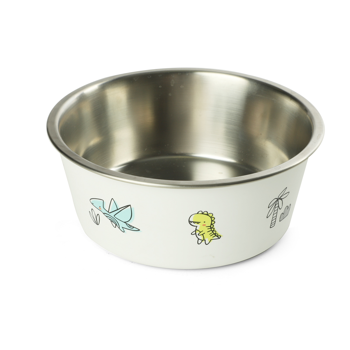 Стильная круглая миска из нержавеющей стали "Динозаврики" с высокими бортиками идеально подходит как для воды, так и для корма разной консистенции. Миска комфортна для питомцев и легко моется под струей проточной воды с использованием бытовых моющих средств. Прорезиненное основание в виде лапки обеспечивает максимальную устойчивость, препятствуя скольжению изделия во время использования, а оригинальный принт сделает такую миску украшением любого интерьера. Цвет изделия: белый с цветным принтом. Объем изделия: 0,7л. Размер изделия: d153*62мм (d дна - 120мм).