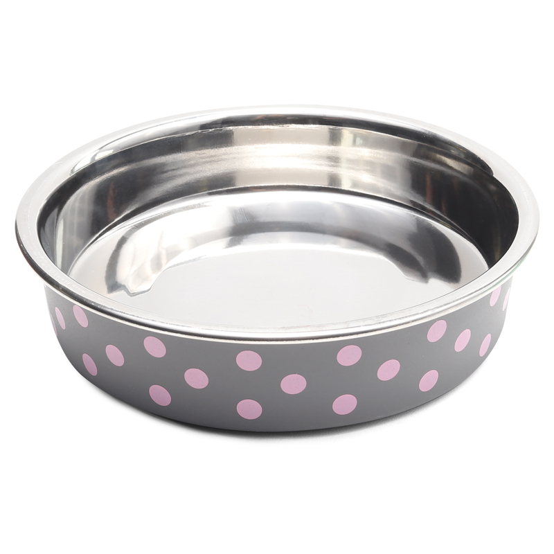 Стильная круглая миска из нержавеющей стали для кошек и собак небольших пород. Она идеально подходит как для воды, так и для корма разной консистенции. Миска комфортна для питомца и легко моется под струей проточной воды с использованием моющих бытовых средств. Прорезиненное основание обеспечивает максимальную устойчивость, препятствуя скольжению изделия во время использования, а оригинальный принт сделает такую миску украшением любого интерьера. Цвет изделия: темно-серый. Объем: 0,25л. Размеры: 120*120*40мм.