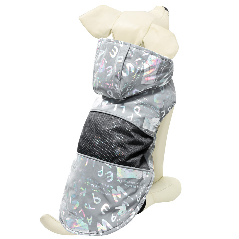 Стильная утепленная попона "Спорт-шик" с капюшоном для комфортных прогулок даже в самую ненастную погоду. Попона украшена перламутровым узором из букв и черной сеточкой на спине. Изделие застегивается при помощи трех заклепок на животе. Легко надевается и снимается. Трикотажная подкладка с утеплителем.
