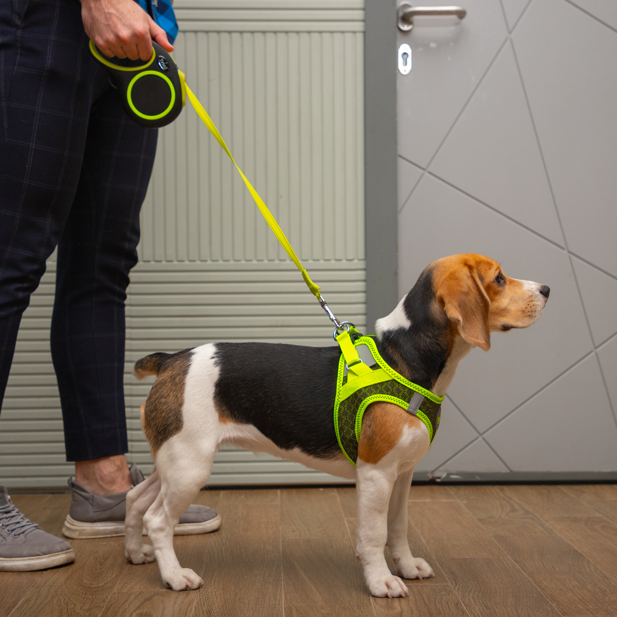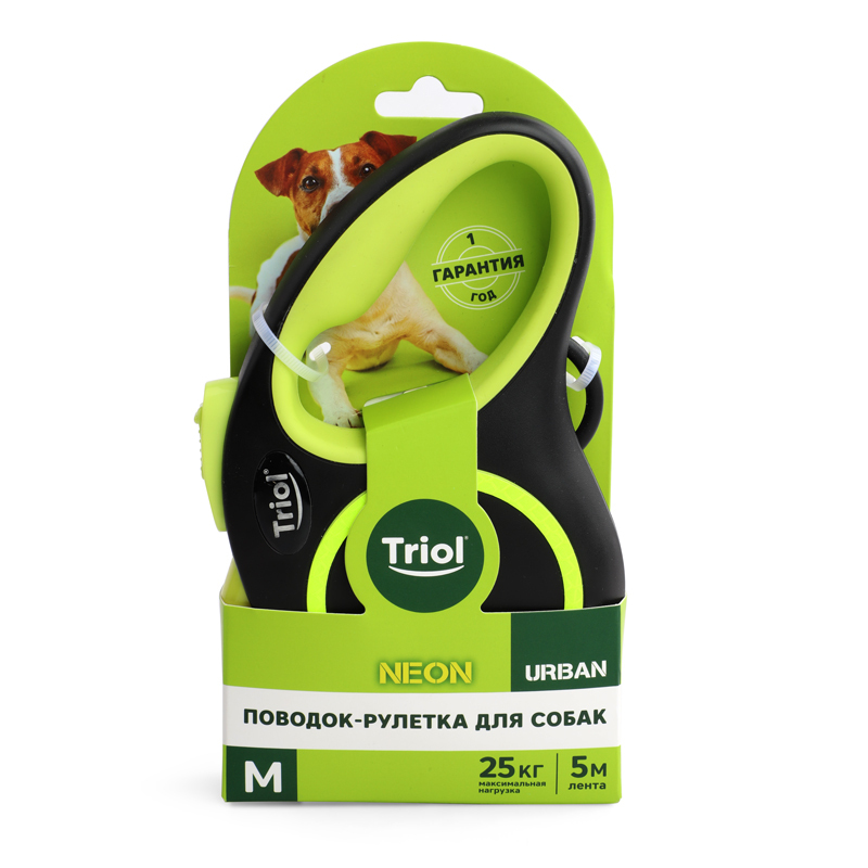 Рулетка предназначена для собак средних пород весом не более 25кг. Длина ленты 5м. Цвет: неоново-желтый с черным.