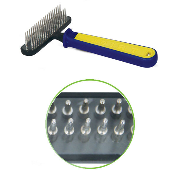 Двухрядная расческа-грабли серии "Спорт" с удобной пластиковой ручкой и 20 крупными металлическими зубцами в каждом ряду. Изделие предназначено для бережного расчёсывания шерсти пушистого питомца.