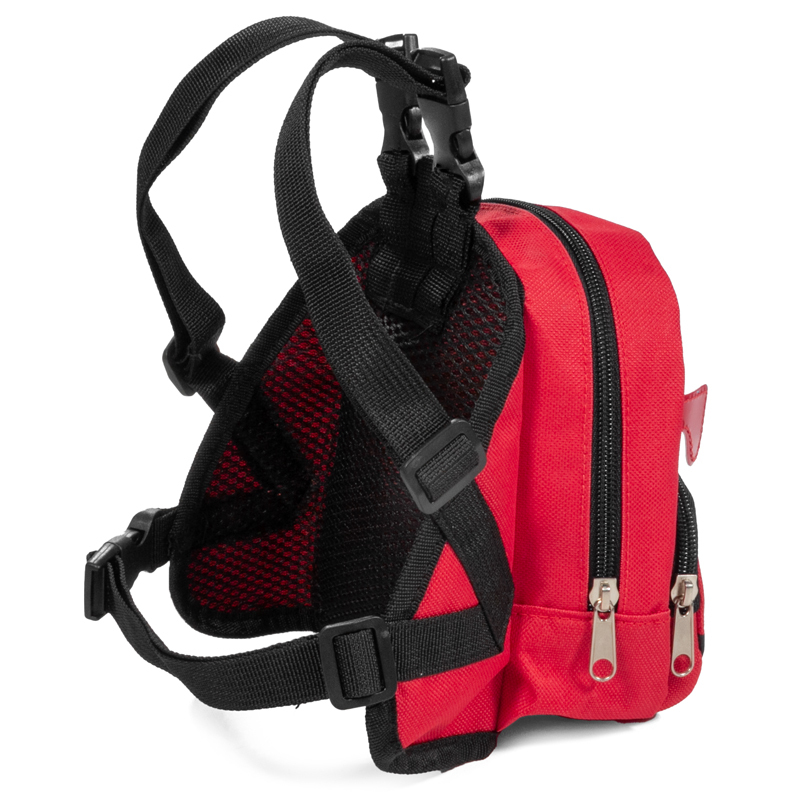 Оригинальный рюкзак-шлейка для собак небольших пород - креативный аксессуар, который станет отличным дополнением яркого образа вашего питомца. Помимо эксклюзивного дизайна изделие наделено и полезной прикладной функцией. Два кармана на молнии позволят взять с собой важные мелочи, регулируемые по длине лямки сделают посадку рюкзака максимально удобной для питомца, мягкая сетчатая вставка обеспечит вентиляцию и не допустит натирания, а прочное металлическое кольцо позволит пристегнуть к шлейке любой поводок. Цвет: красный. Обхват груди: 450-550мм. Размер рюкзачка: 170*150*90мм.