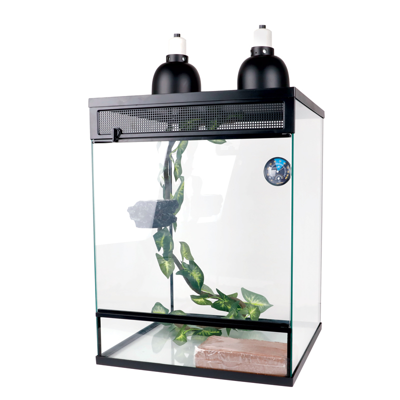 Террариум с наполнением включает в себя все, что необходимо для содержания животных. Основа комплекта – террариум из силикатного стекла со съемной крышкой, выполненной из металлической сетки с пластиковой рамкой. Также в комплекте два металлических светильника с керамическим цоколем, нагрузка на каждый светильник до 150Вт, термогигрометр, кокосовое волокно в брикете, подвесная двойная кормушка, гибкая искусственная лиана. Террариумный набор предназначен для комфортного содержания йеменских, пантеровых и других хамелеонов, анолисов рыцарей, водяных агам, василисков, токи и других крупных древесных ящериц, а также древесных лягушек. Размер: 466*466*611мм
