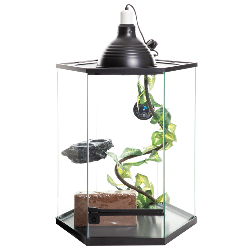 Террариум с наполнением включает в себя все, что необходимо для содержания животных. Основа комплекта – террариум из силикатного стекла со съемной крышкой, выполненной из металлической сетки с пластиковой рамкой. Также в комплекте металлический светильник с керамическим цоколем, нагрузка на светильник до 150Вт, термогигрометр, кокосовое волокно в брикете, подвесная двойная кормушка, гибкая искусственная лиана. Террариумный набор предназначен для комфортного содержания древесных лягушек, фельзум, бананоедов и других древесных ящериц, а также для небольших хамелеонов. Размер: 484*422*565мм