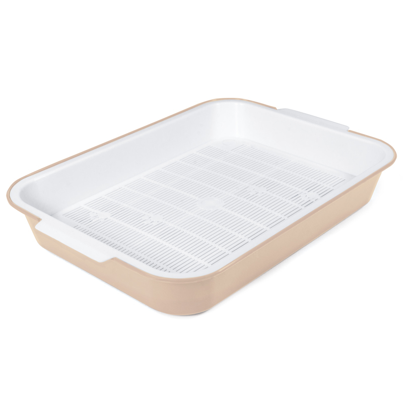 Туалет c белой сеткой - универсальный аксессуар для вашего четвероногого питомца. Такая модель идеально подходит для кошек, не любящих наполнитель. Съемная сетка максимально упрощает уборку, а компактные габариты изделия позволят разместить его где угодно с комфортом для животного. Туалет изготовлен из высококачественного пластика и легко чистится под струет воды при помощи моющих бытовых средств. Цвет: бежевый.