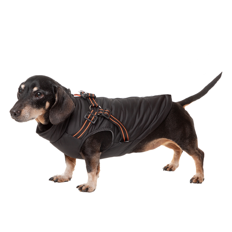 Удобный и функциональный жилет на теплой подкладке из флиса "Спорт" выполнен из водоотталкивающей и ветронепроницаемой ткани, которая защитит питомца от холода и грязи. Застежка-молния на спине максимально облегчает одевание питомца, а два кольца для крепления поводка позволяют обойтись без дополнительной амуниции. Размер: длина спины 400 мм, обхват груди 560 мм. Цвет: черно-оранжевый.